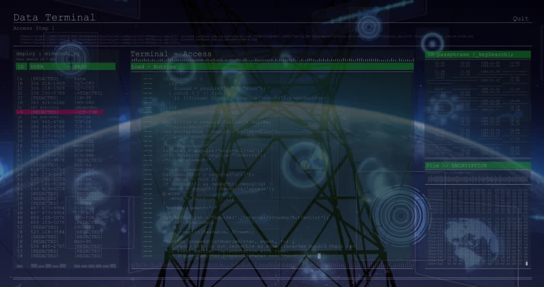 Futuristic representation of data processing and cybersecurity featuring animated connecting networks overlaid on a dark background. Cyber elements such as coding terminals and global outlines in the abstract design illustrate ideas around global data exchange and digital protection. Useful for topics on technology advancements, data extraction services, cyber protection strategies, and global network systems.