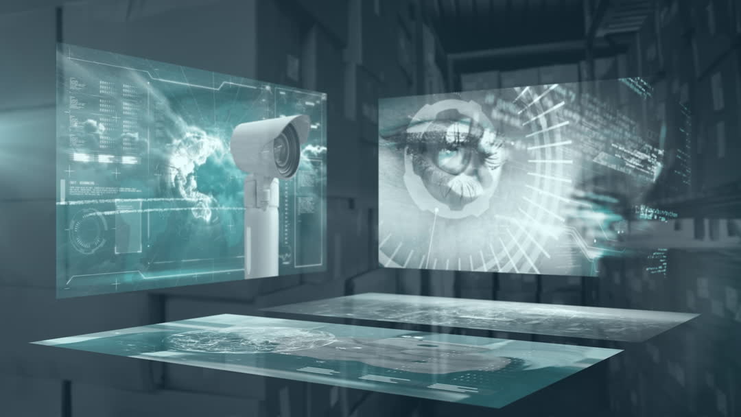 Concept animation displaying security camera leveraging modern data processing and surveillance technology. Screens show digital interfaces with abstract designs highlighting analysis and monitoring capabilities. Ideal for showcasing articles or presentations on future technology, smart security systems, and advancements in artificial intelligence.