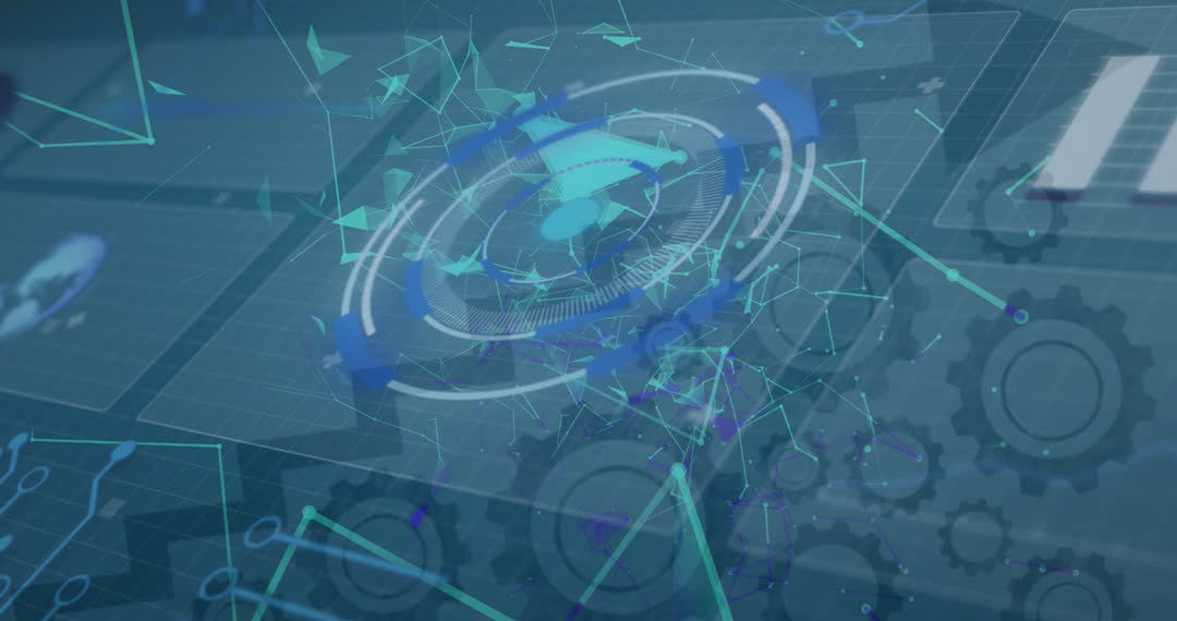 Dynamic illustration of data processing and virtual interface blending futuristic technology elements with schematic gear visuals. Ideal for tech websites, presentations on digital transformation, or corporate promotions highlighting innovation and global business solutions.