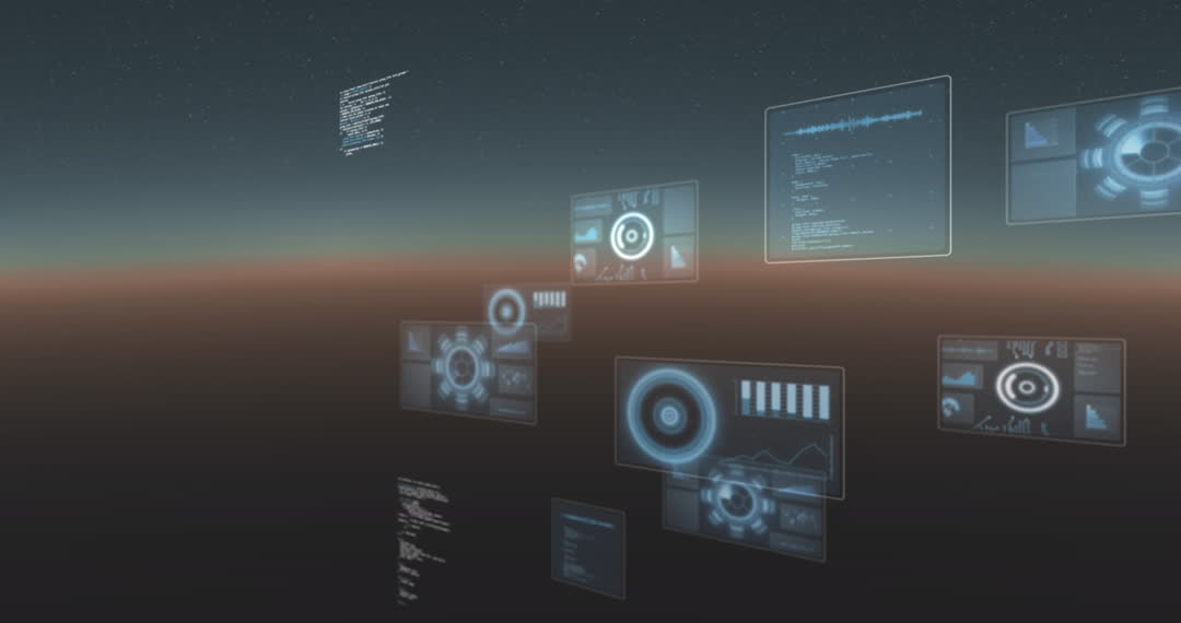 Illustrates futuristic display with holographic screens, useful for illustrating advanced technology, digital transformation, and innovations in data processing. Ideal for website backgrounds, tech presentations, or informational videos related to information technology, digital analytics, and futuristic studies.
