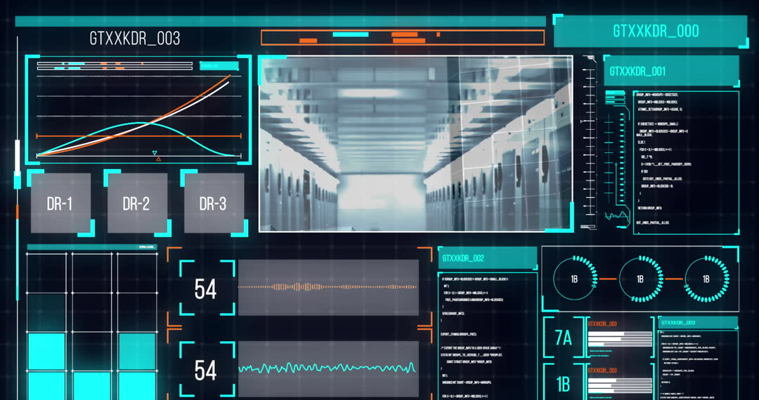 An animated scene displaying data processing within a futuristic digital interface. Various graphs, dials, and metrics on a blue background evoke high-tech and analytical themes. Ideal for use in industry presentations, educational videos on technology trends, and visualizing complex data systems in motion film productions.