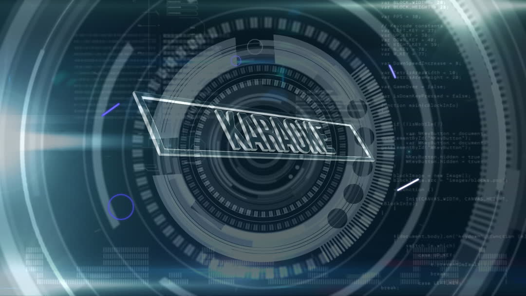 This visual represents a blend of digital interface themes with futuristic data elements accentuated by a karaoke text centerpiece. Neon effects enhance a sci-fi feel, adding to modern design uses. Useful for presentations, marketing materials, or applications related to high-tech business and entertainment technology contexts.