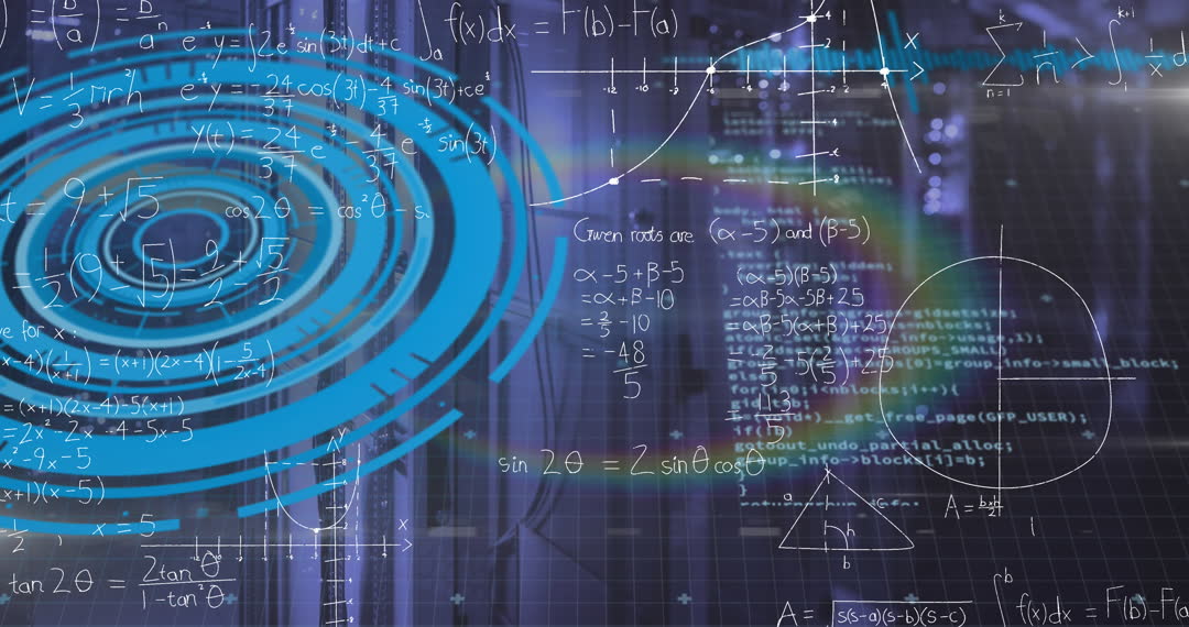 Vibrant visual shows advanced data processing with mathematical equations overlaying servers, suggesting themes of digital advancement and data analytics. Suitable for illustrating concepts in modern technology, big data, internet infrastructure, and innovation in digital interfaces. Ideal for use in tech magazine articles, educational materials on computing, or background in tech presentations.