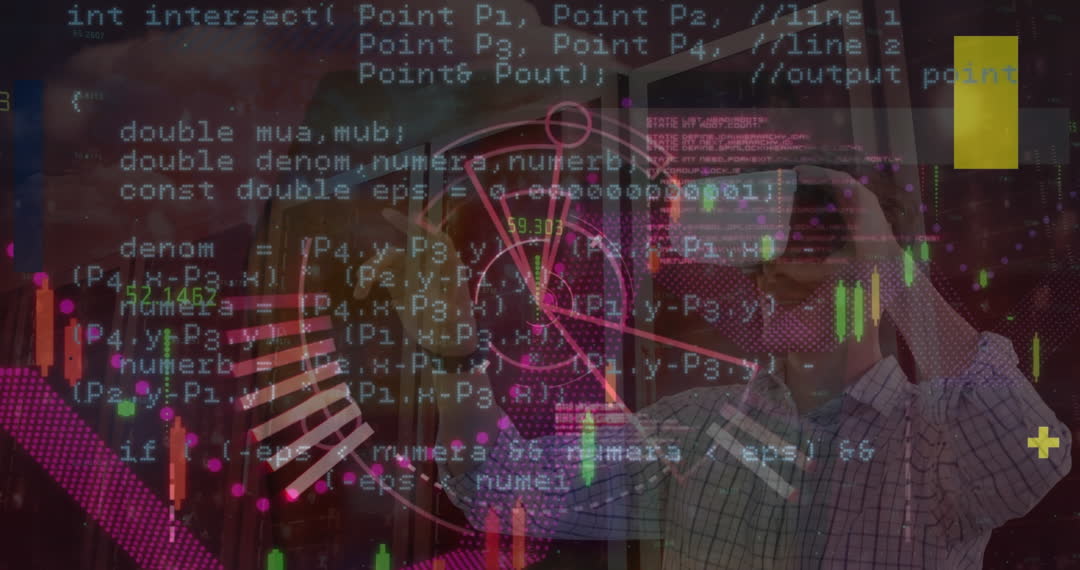 This illustration is ideal for showcasing technology-driven videos or presentations about data processing and global business growth. It can be used in contexts focusing on innovation, programming languages, or AI advancements due to its combination of codes and abstract visuals.