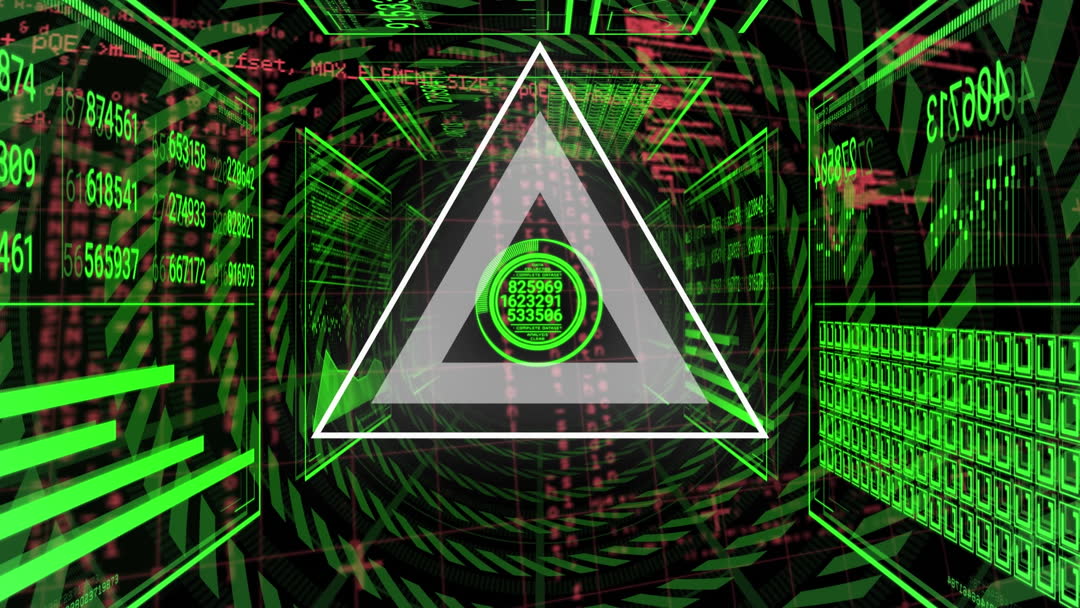 Abstract digital scene featuring a triangular shape surrounded by a green data stream and a tunneling effect. The design represents advanced computer interfaces, high-speed data analysis, and futuristic tech environments. Useful for representing concepts of cybersecurity, technology advancements, or server networks in technology publications, advertisements, or multimedia presentations.