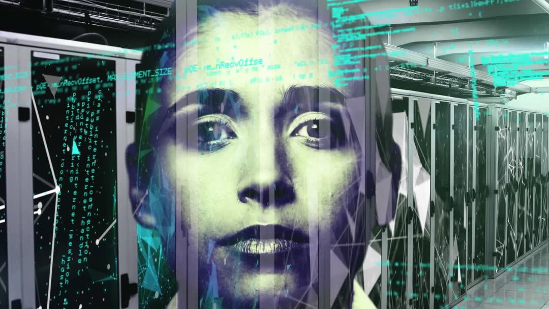 This video combines elements of technology with a human face hologram superimposed over a server room, conveying themes of data processing and digital interfaces. Ideal for illustrating concepts in IT services, cybersecurity, artificial intelligence, and global networking programs.