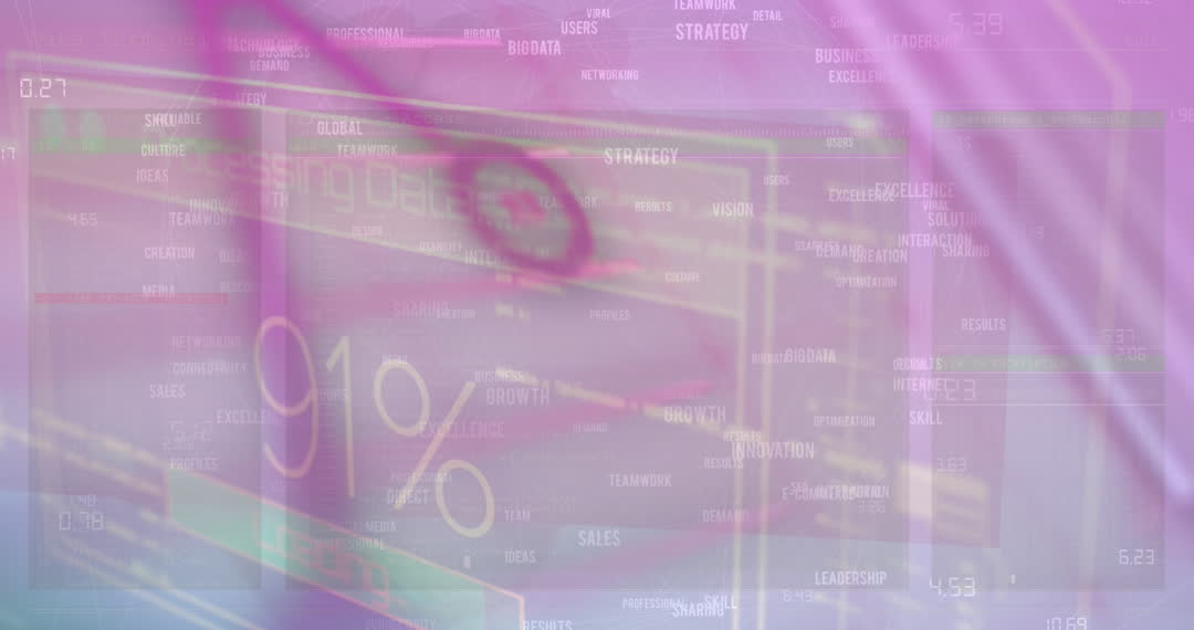This illustration shows a futuristic digital interface overlayed with data elements such as analytics graphs and percentage symbols against a vivid purple backdrop. Ideal for use in presentations or content related to business strategy, technological advancement, innovative digital solutions, or analytical processing, emphasizing modern digital trends and strategic insights.