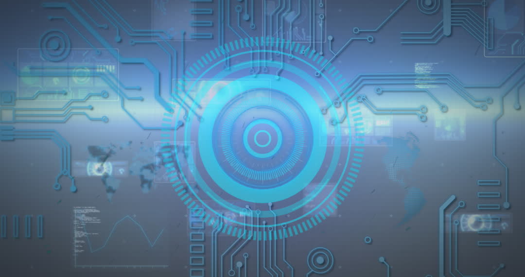 Futuristic data processing interface showing digital circuits and interface elements over a blue background with a faint global map. Ideal for illustrating concepts in digital transformation, technology infrastructure, data analytics platforms, software development innovations, and artificial intelligence solutions. Useful for tech articles, business presentations, or educational materials on emerging digital technologies.