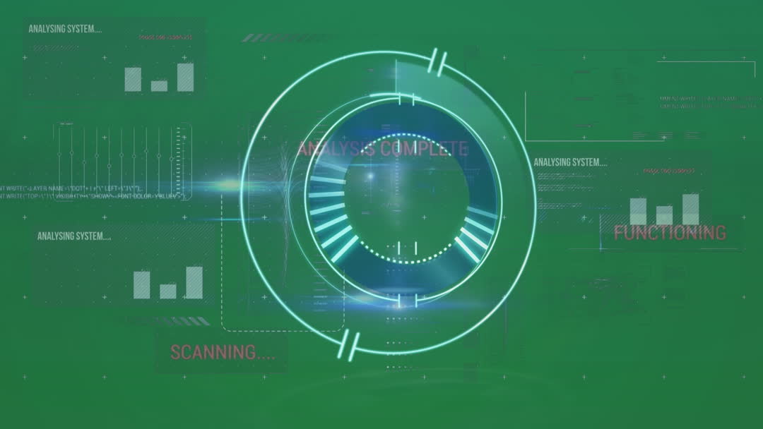Futuristic animation featuring a digital processing circle over a data-driven interface displayed on a green background. Perfect for portraying themes of technology, data analysis, and innovation. Ideal for use in presentations, tech service adverts, or immersive virtual reality scenarios highlighting tech advancements.