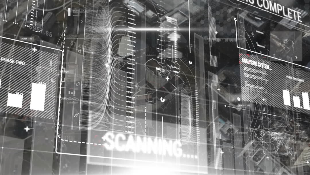 Futuristic Data Processing Interface with Cityscape Overlay Video