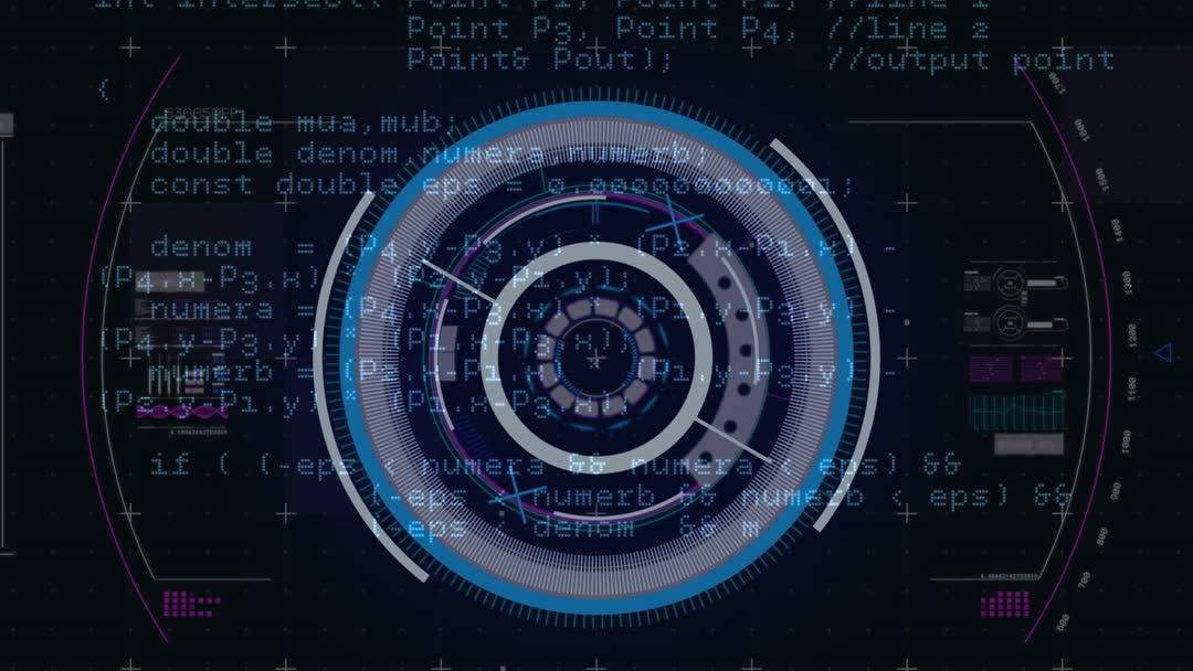 Visual features a futuristic circular interface with digital code and graphics suggesting advanced technology and digital processes. Suitable for uses in illustrating high-tech concepts, sci-fi themes, technology presentations, and digital innovation in media or advertising campaigns.