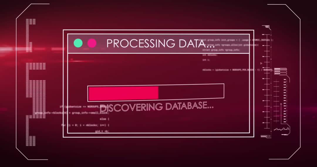 Animation showing a technological interface featuring a progress bar indicating data processing and discovering database processes, commonly used for business technology presentations, tech-related educational videos, or software demonstrations.