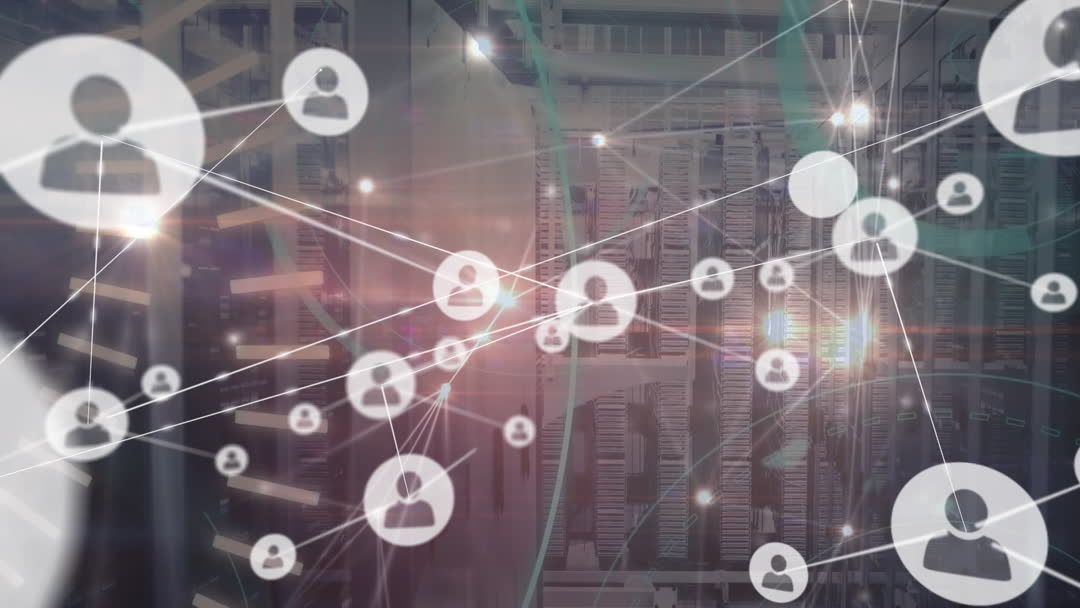 Image portrays interconnected network with digital icons overlaid on servers, illustrating technology integration and connectivity. Represents data communication in modern business environments, suitable for articles on IT infrastructure, cloud computing, or technological advancements.