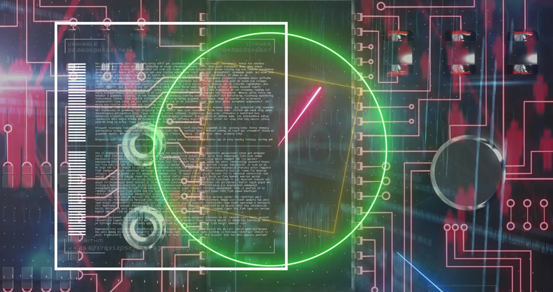 Abstract illustration of data processing on a digital display, featuring vibrant neon colors and dynamic graphics. Green concentric circles hold coded text and geometric lines, representing cyber technology and digital networks. Ideal for presenting themes related to future tech, AI, computer networking, and digital security industries. Can be used in presentations, tech start-up advertisements, blogs on digital transformation, or articles focused on technological advancements.