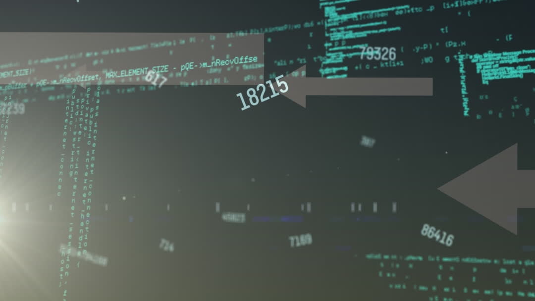 An abstract representation of data processing with digital code and arrows, symbolizing global business and digital innovation. Ideal for depicting technology trends, data analytics communities, or IT security. Useful in presentations for software development and digital project management.