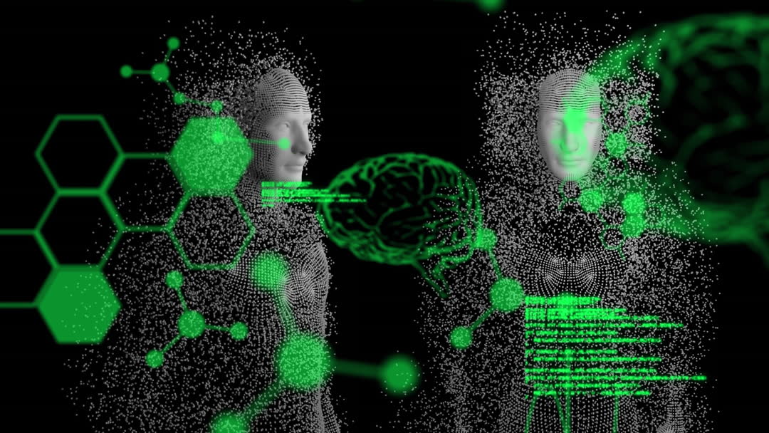 Digital illustration features futuristic data processing with green graphics over human models against a black background. Ideal for representing concepts related to artificial intelligence, cybernetics, or digital interfaces. Suitable for technology presentations, science articles, and educational materials focusing on advanced technological evolution.