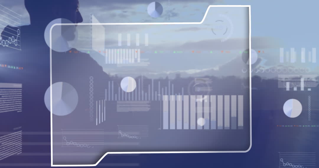 Image shows an animated concept of data processing with digital charts and graphs overlaid on a serene landscape and the silhouette of a person. The contrast of technology with nature symbolizes innovation and futuristic path in business analytics. Useful for themes centered on technology blending with nature, digital transformation, or modern data analysis solutions.