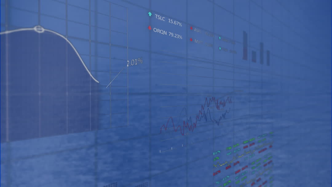 Information technology visuals showing data processing animation on blue background with grid graphic elements including charts and graphs. Suitable for use in presentations involving business analytics, financial sectors, technology startups, and data-driven decision making. Ideal for use in blogs or promotional materials related to technology innovation and financial markets.