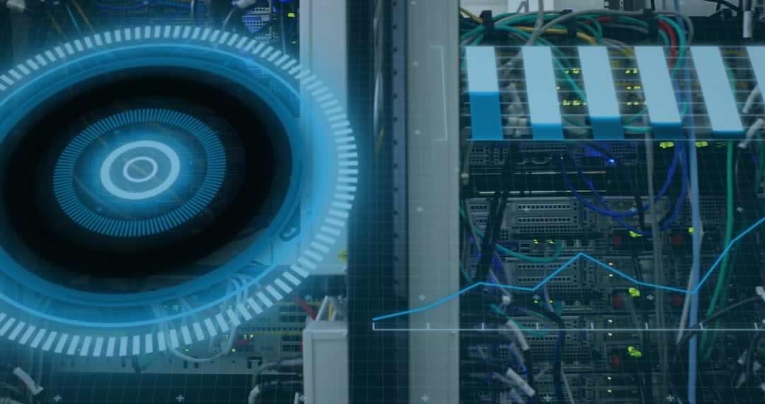 Animation showcases a high-tech data processing environment combining real server racks with digital overlays. Futuristic scope graphic scans the setup, enhancing the emphasis on advanced global computing and network functionality. Useful for illustrating concepts related to cybersecurity, digital networking, and modern technological innovations.