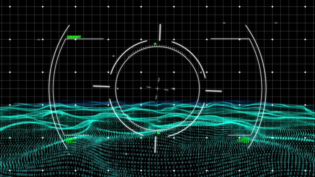 Grid overlay with a scanning target display on green light trails, suggestive of advanced data processing. Ideal for illustrating digital technology, cybersecurity themes, or virtual reality concepts in presentations and media.