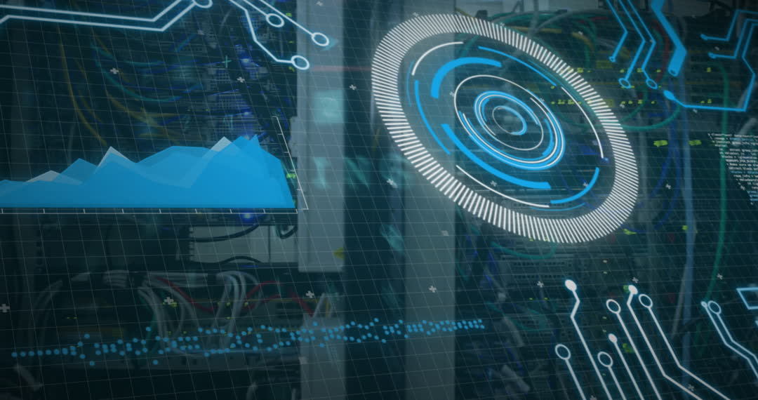 The animation visualizes futuristic data processing with digital tech elements, such as a radar-like scanning feature, graphs, and circuit patterns. The dynamic digital elements suggest themes of advanced technology and cybersecurity. This animated depiction is ideal for content related to technology trends, digital transformation, tech conferences, and network security visual storytelling.