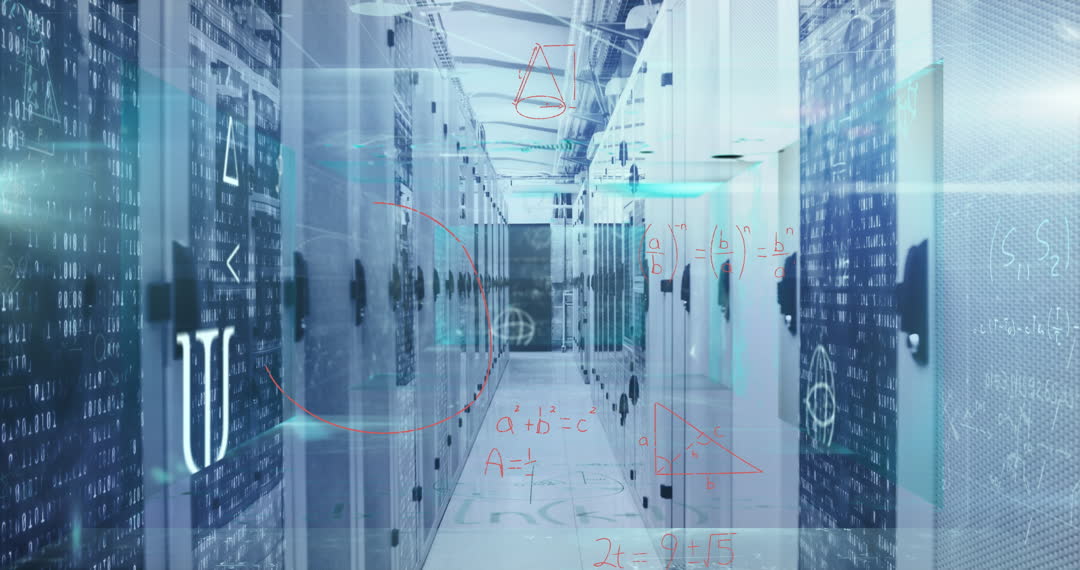 Visual representing advanced data processing in a modern server room with mathematical equations overlaying the scene. The video symbolizes technology, global communication, networking, and innovation. Appropriate for illustrating AI concepts, digital infrastructure, educational materials, and futuristic technological concepts.