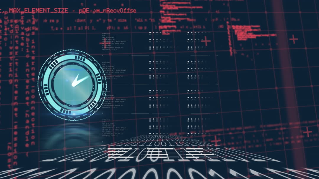 Dynamic visualization shows fast-moving clock and digital data display, highlighting power and speed in tech-driven environments. Ideal for illustrating themes of technological advancement, cybersecurity significance, or futuristic data processing in IT presentations or promotional materials.