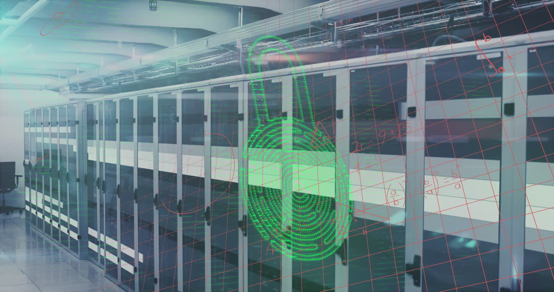 Image depicts digital security lock icon in server room environment. Represents cybersecurity, secured data access, or high-tech innovation. Useful for illustrating IT security themes in presentations or websites.