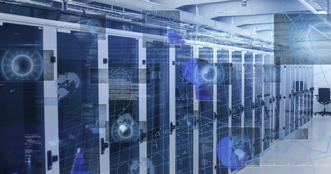 Image shows a high-tech server room with digital projections of mathematical equations. Ideal for content related to cloud computing, advanced IT solutions, or futuristic technology innovations. Useful for illustrating concepts of data management, storage, and processing in modern technology discussions.