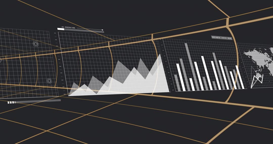 Innovative futuristic panels showcasing data analytics glide through a dynamic 3D wireframe tunnel. Area peaks, bar charts, and a world map highlight analytical insights through immersive technology. Useful for themes of data analysis, technology evolution, virtual platforms, and digital transformation in presentations and marketing materials.
