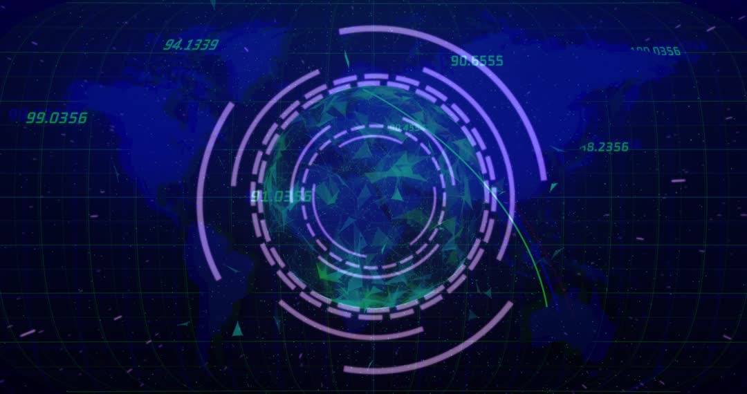 Dynamic rotation and pulsing rings over a global map suggest a high-tech data monitoring system ideal for tech companies, digital security themes, or showcasing futuristic concepts in technology demonstrations.