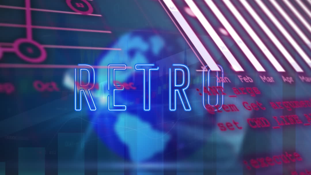 This visualization shows neon 'Retro' text overlaying coded data and a world map. Use in materials related to technology development, retro-inspired interfaces, or instructional videos on data processing and analysis.