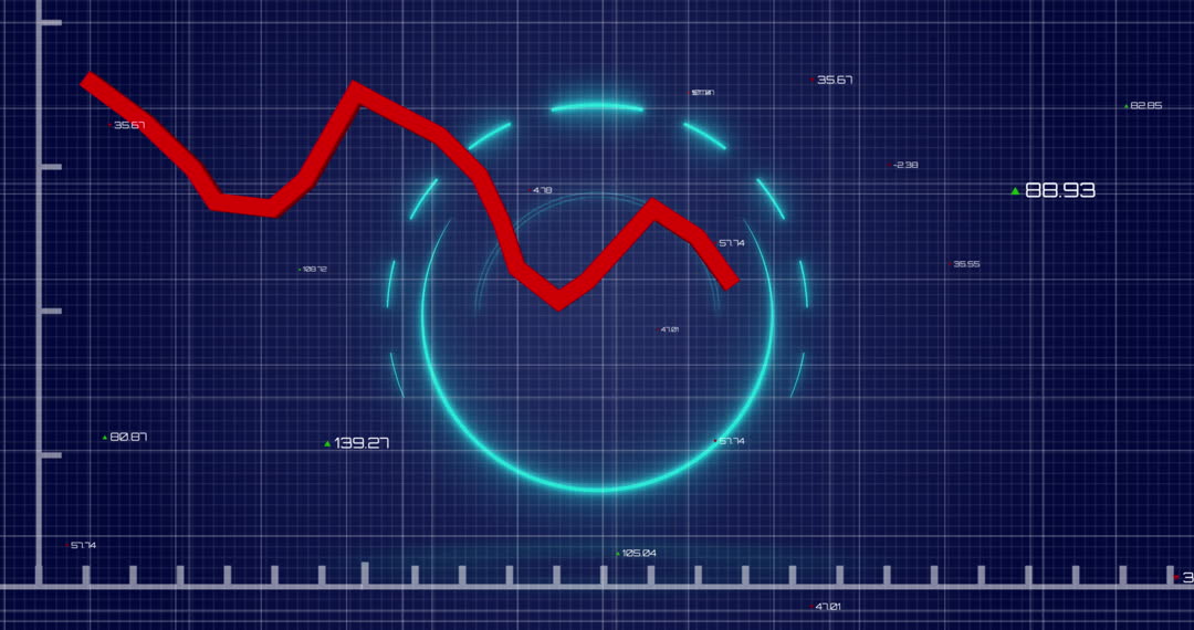 The graphic presents a sleek digital interface featuring a red line graph overlay against a blue grid background. This chart symbolizes real-time data processing commonly associated with global business and economic analysis. Perfect for use in technological presentations, financial reports, and websites focusing on data analytics and digital transformation.