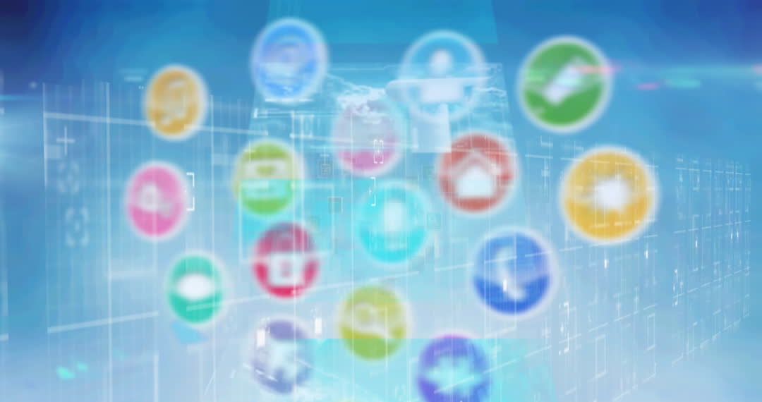 Futuristic scene featuring overlay of colorful, holographic symbols on blurred digital background suggests technical innovation. Ideal for presentations about communications technology, digital transformation advances, or futuristic concepts emphasizing data networking.