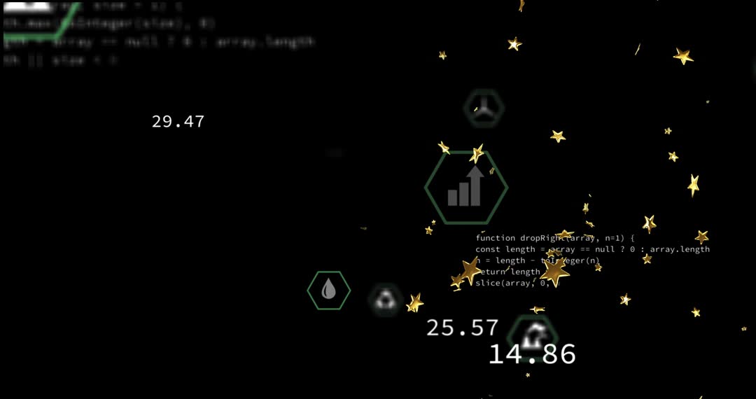 This engaging composition of data visualization features a blend of interactive icons, real-time code snippets, and fluctuating metrics centered prominently around a glowing CO2 icon, enhancing its relevance to environmental analytics and sustainability. The use of dropping icons over a dark canvas adds dynamism and visual interest. This resource is ideal for use in presentations or digital media that emphasize technology themes, ecological responsibility, or modern interface design accents.