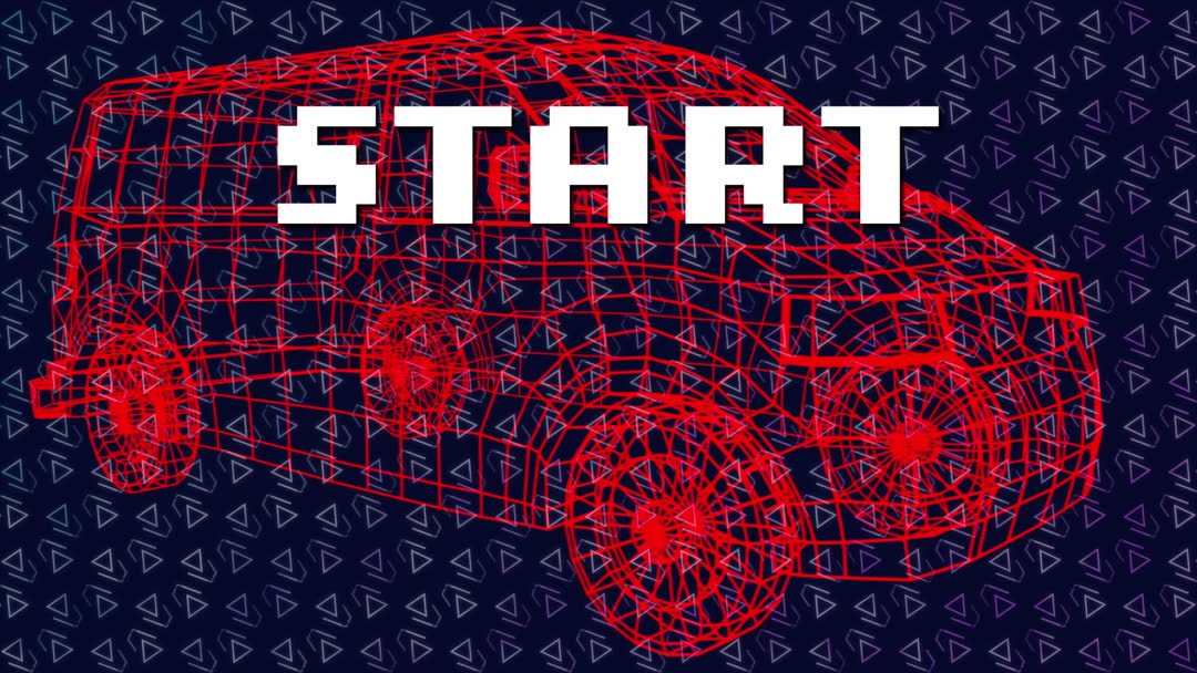Futuristic digital animation features a red wireframe vehicle with 'START' written above, set against a blue background adorned with geometric shapes and neon colors. Ideal for technology-themed presentations, advertising campaigns related to automotive innovations, visual aids for futuristic concepts, or retail business promotions conveying advanced thinking or dynamic starts.