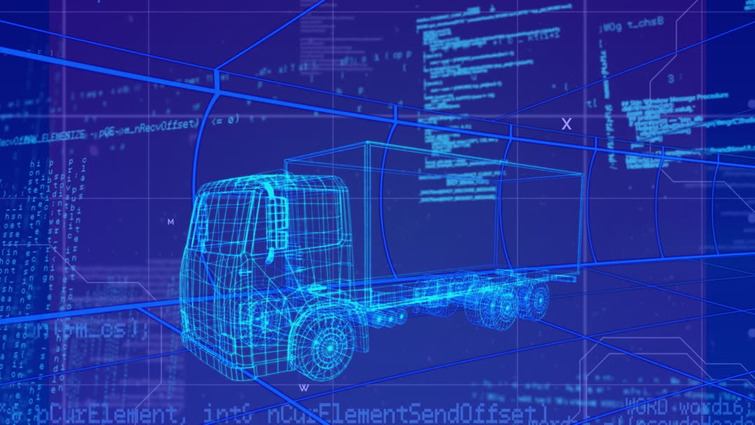 Digital rendering showcases a futuristic wireframe model of a truck overlaid with data codes in a virtual grid. Ideal for visual content related to automotive technology, digital innovation, and engineering systems, highlighting concepts of virtual reality, data processing, and modern digital frameworks.