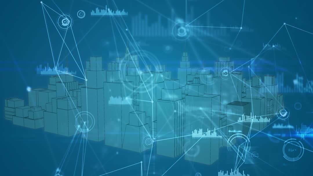 Animation depicts a conceptual digital city, with lines and nodes representing a network of connections over a blue background, appealing for technology and innovation themes. Suitable for use in presentations or visual content about futuristic cities, data innovation, smart infrastructure, and global connectivity concepts, reflecting the integration of digital networks in urban landscapes.