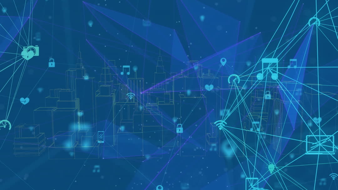 Illustration featuring a futuristic digital cityscape overlayed with global connection icons, including security locks, hearts, and Wi-Fi symbols. The blue backdrop and network lines suggest advanced technology, digital communication, and interconnectedness. Suitable for use in technology-focused materials, presentations on digital communication, cybersecurity demos, and futuristic designs.