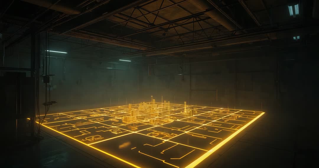 AI Generated Image. Golden towers rise dramatically, casting a futuristic vibe within a dimly lit warehouse. Platform pulsates with radiant light against dark backdrop, captivating the viewer with its architectural complexity and digital ambiance. This scene embodies the blending of technology, innovation, and future city planning. Ideal for use in tech-related contexts, futuristic and architectural visual effects, digital reality themes, and advertising for cutting-edge technological developments or innovative product sectors.