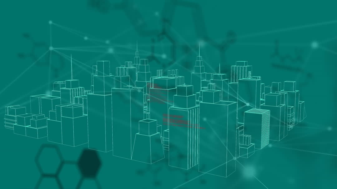This detailed animation showcases a futuristic digital cityscape interconnected with networks and overlaying chemical formulas against a green backdrop. It is perfect for presentations or visualizations focusing on technology innovations, digital environments, or scientific applications, illustrating a harmonious blend of urban planning and technological integration.