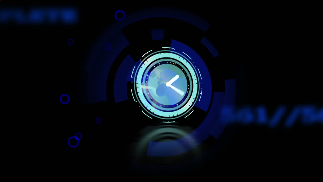 This design showcases a dynamic animation of a digital clock overlaying a globe, surrounded by high-tech shapes on a deep black background. The animation symbolizes the intersection of global business and technology, conveying themes of innovation, digitalization, and connectivity. Ideal for presentations on international business trends, tech services, time management tools, or as a futuristic screen saver.