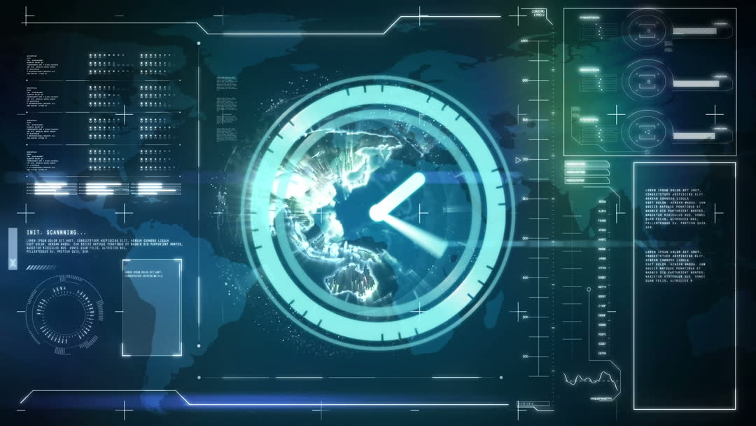 Futuristic interface showcases digital clock elements overlaid on a dark background filled with data panels and a world map. Ideal for conveying themes of advanced technology, science fiction, or global connectivity, and can be used in tech presentations, digital innovation expos, or storytelling requiring a high-tech aesthetic.