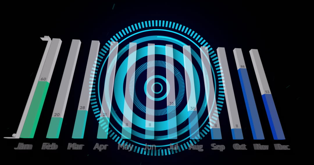 Animation showing a futuristic interface with digital data analyzed through moving scopes over month chart. Ideal for illustrating concepts related to digital technology, data analytics presentations, modern technological advances, and digital interfaces. Perfect for website backgrounds, tech blogs, and digital transformation videos.