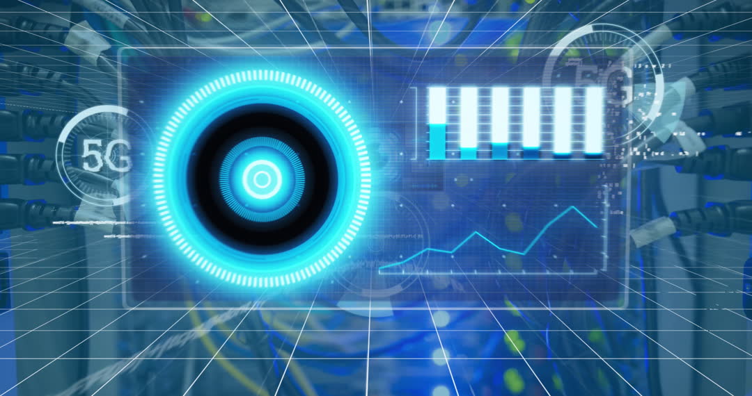 A digital animation overlaying a data interface with charts, graphs, and 5G panel against a server room background. Use for technology blogs, future tech presentations or articles on digital innovation and cyber security advancements.