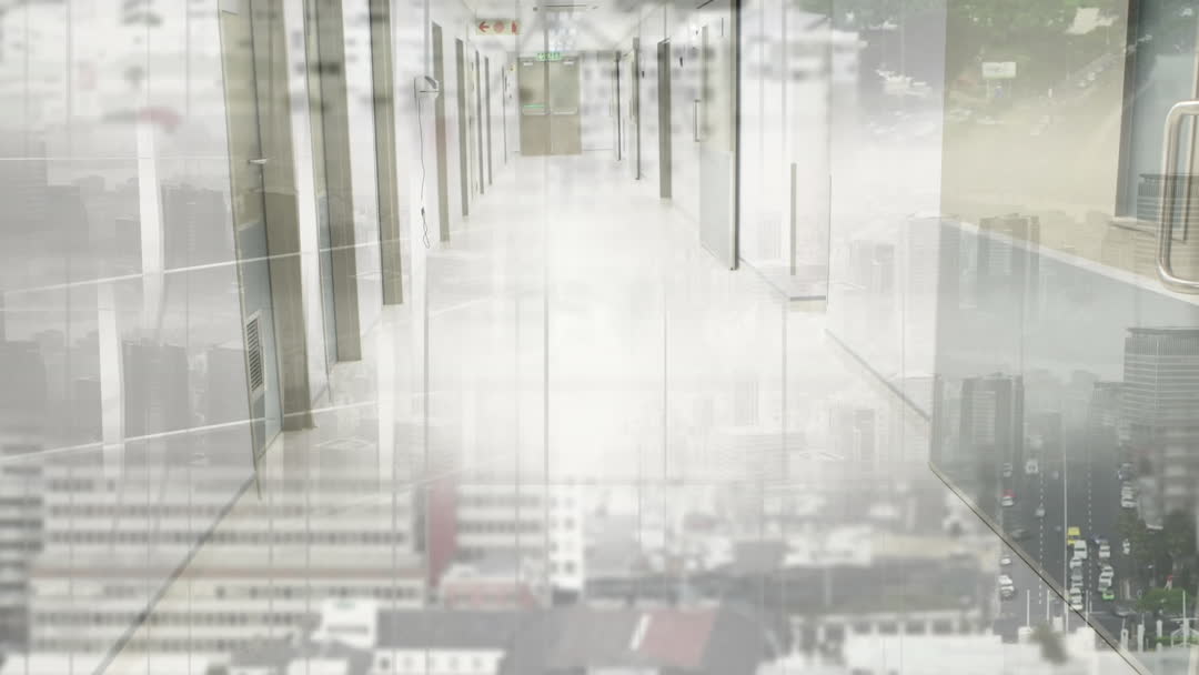 The video depicts a futuristic fusion of a hospital hallway with a cityscape, enhanced by a digital data overlay. This showcases the integration of technology and healthcare, mirroring global medicine and innovative practices. Ideal for presentations or articles focusing on medical advancements, urban healthcare solutions, or futuristic technology.