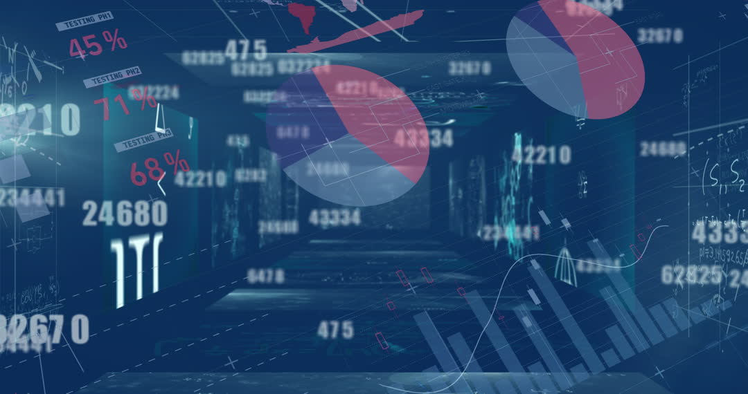 Abstract visualization depicting advanced digital data processing concepts. Illustrates technology themes and statistical analysis with overlaid pie charts and numbers. Ideal for showcasing subjects related to data analytics, global business, and modern interfaces in presentations, reports, or tech-related marketing materials.