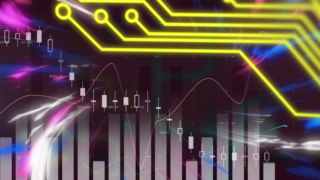 This video illustrates a futuristic digital data processing concept with vibrant elements like circuit board designs and animated charts. Use this visual for presentations on technological advancements, financial analytics, or innovation in data science.