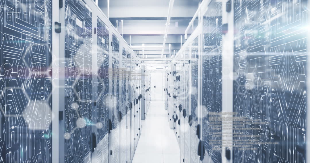 Modern server room shown with overlay of digital data, conveying advanced global technological processes. Ideal for illustrating concepts related to innovation, data management, cybersecurity-themed projects or articles exploring digital interfaces or global networking advances.