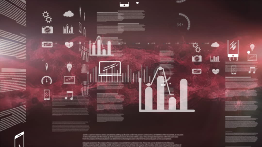 Visual representation of abstract data processing icons cascading over a stylized DNA strand backdrop. The use of vibrant red tones emphasizes technological advancement and global connectivity. Ideal for illustrating concepts in digital technology, science, research, IT solutions, or as an educational tool in data analysis fields.